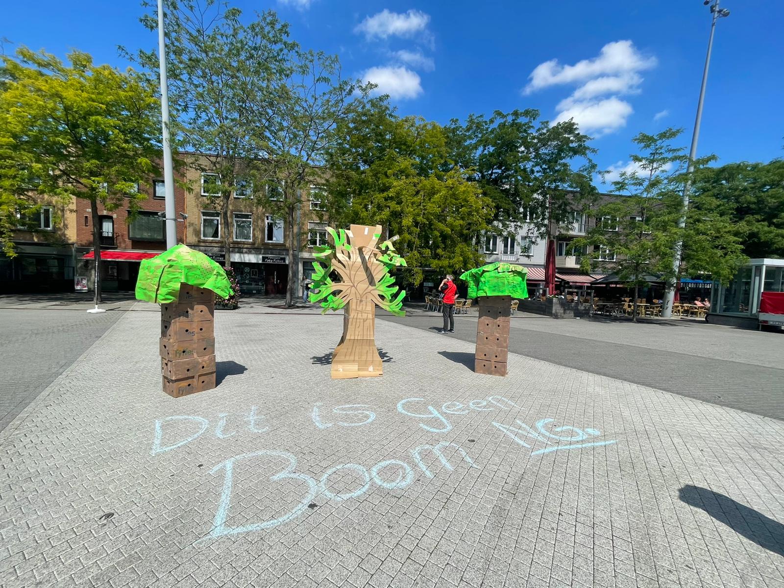 Daarna werden de bomen aangekaart. Of beter gezegd; geen bomen. Het gebrek aan bomen, planten of bloemen in het centrum was het volgende irritatiepunt. Vandaar werden er door ons kartonnen bomen geplaatst met wederom de tekst “Dit is geen boom”.