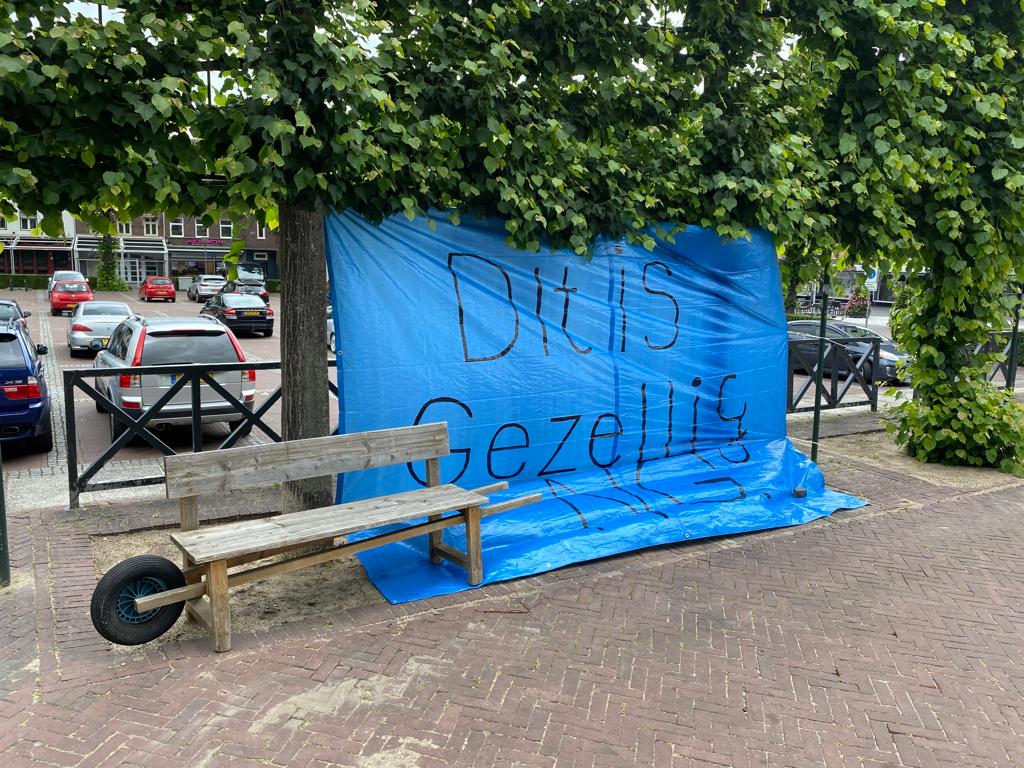Vervolgens werd er een groot doek geplaatst op het marktplein met de tekst “Het is hier gezellig”. Dit aangezien dit er in feite ook niet is, veel inwoners en ondernemers vinden het centrum juist totaal niet gezellig ogen.
